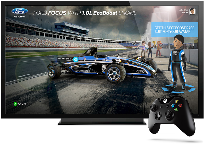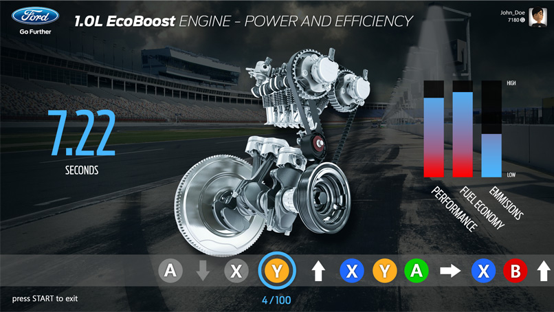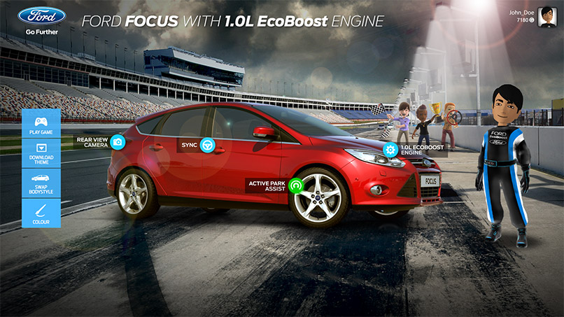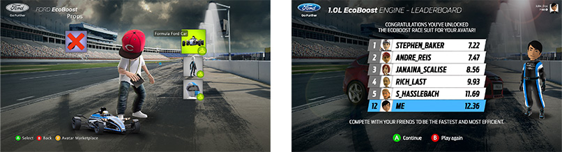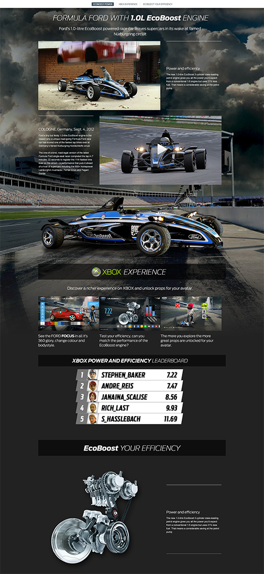Selling in the ultra efficient EcoBoost engine by creating an x-box live advert featuring a mini game where you have to perform as well as the tech does, along with avatar props unlocked as you explore the content.